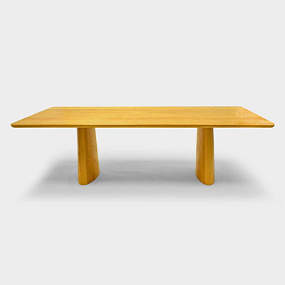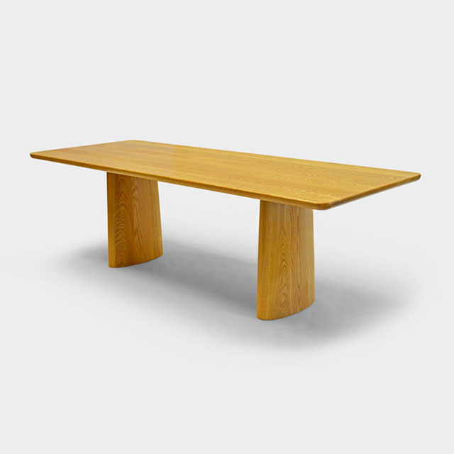 With only three elements making up this dining table, each piece is thoughtfully considered for a minimal result. The legs are substantial and sturdy, hand carved from solid wood into smooth ovals, almost like tree trunks rising upward. The top appears to float above with a soft, rounded edge that invites touch. The underside is free from any interruptions, a simple plane that connects to the legs with concealed steel hardware. Four small hidden fasteners allow for disassembly and transport.