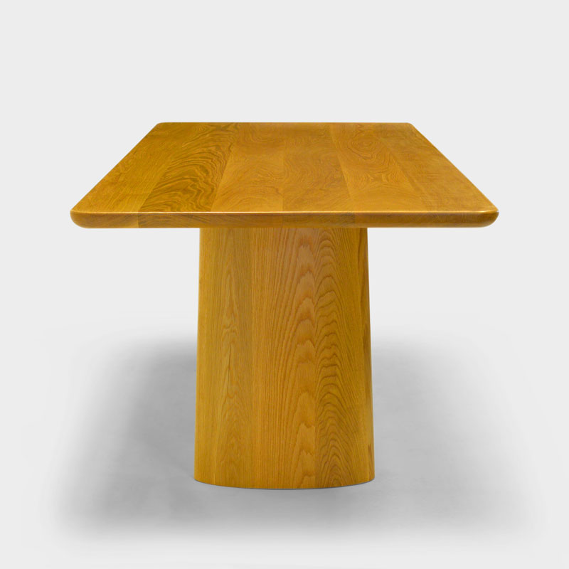 With only three elements making up this dining table, each piece is thoughtfully considered for a minimal result. The legs are substantial and sturdy, hand carved from solid wood into smooth ovals, almost like tree trunks rising upward. The top appears to float above with a soft, rounded edge that invites touch. The underside is free from any interruptions, a simple plane that connects to the legs with concealed steel hardware. Four small hidden fasteners allow for disassembly and transport.