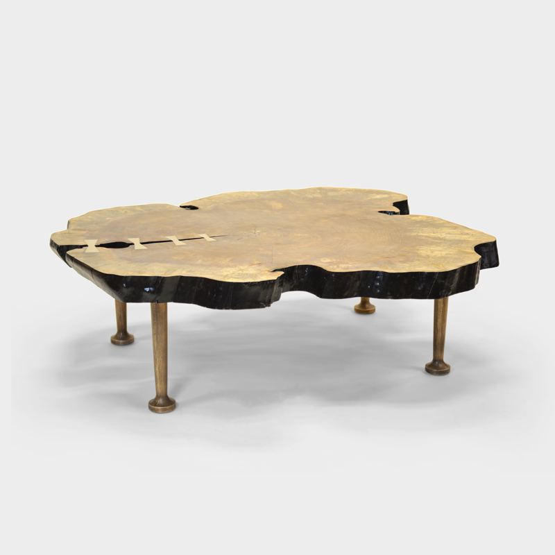 A spalted maple ‘cookie’ slab is the focal point of this low coffee table. Cut across the entire circumference of the tree, a ‘cookie’ shows all of the growth lines and in this case has the irregular perimeter of the original tree. The edge has been burned to provide a dark contrast to the lightly greyed top surface. Cast bronze legs are inset into the bottom while bronze dovetail keys are inlayed into the top to limit the movement of the large natural crack.